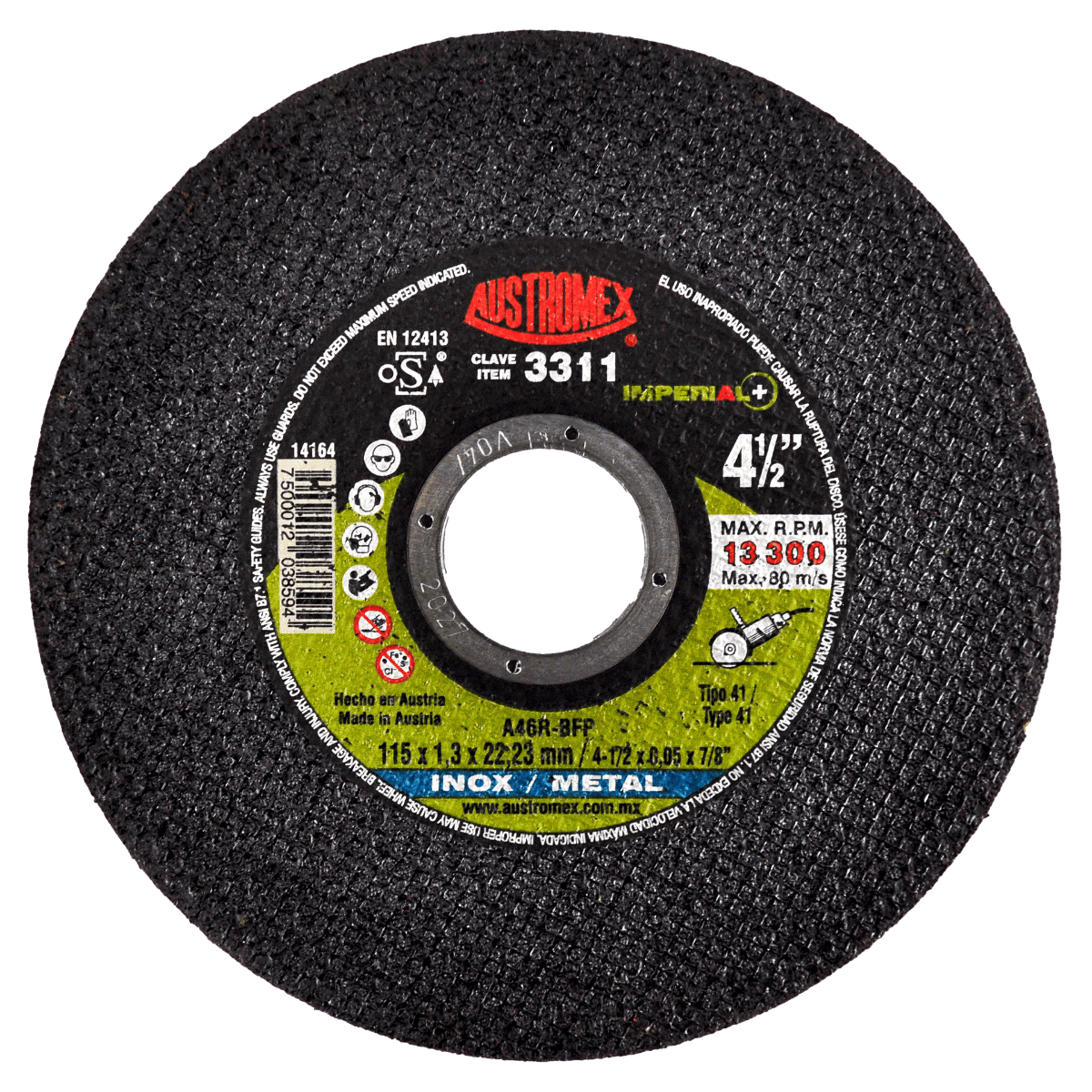3311 41 A46R-BFP 4-1/2 x 0.05 x 7/8 AUSTROMEX Disco para corte de inox y metal de 115 x 1.3 x 22.23 mm Esmeriladora Angular