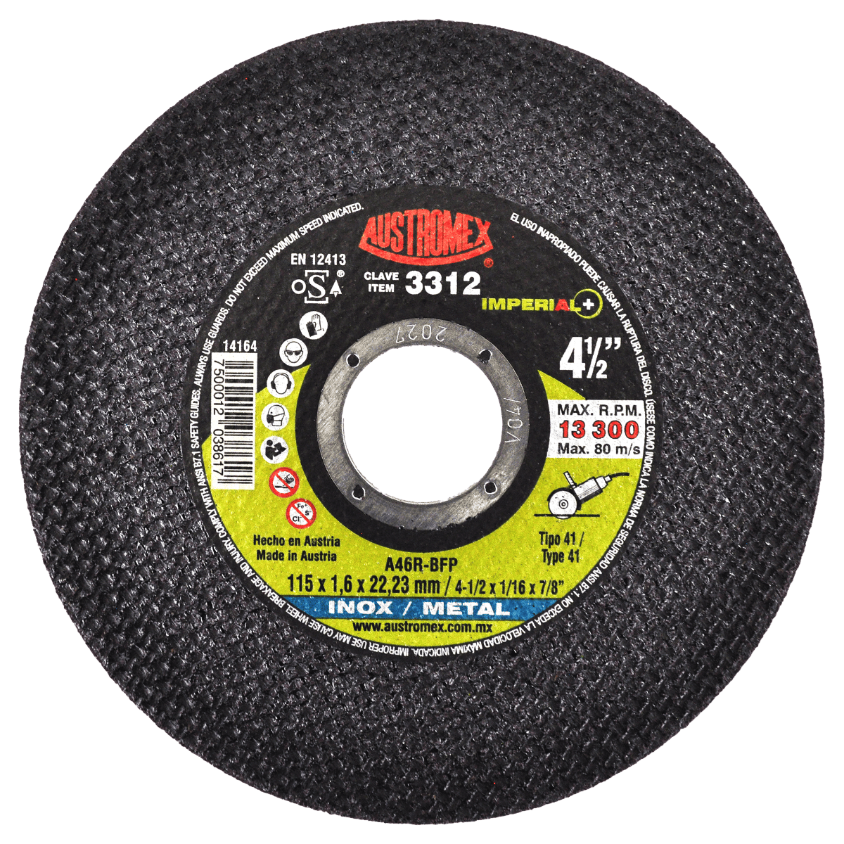 3312 41 A46R-BFP 4-1/2 x 1/16 x 7/8 AUSTROMEX Disco para corte de inox y metal de 115 x 1.6 x 22.23 mm Esmeriladora Angular