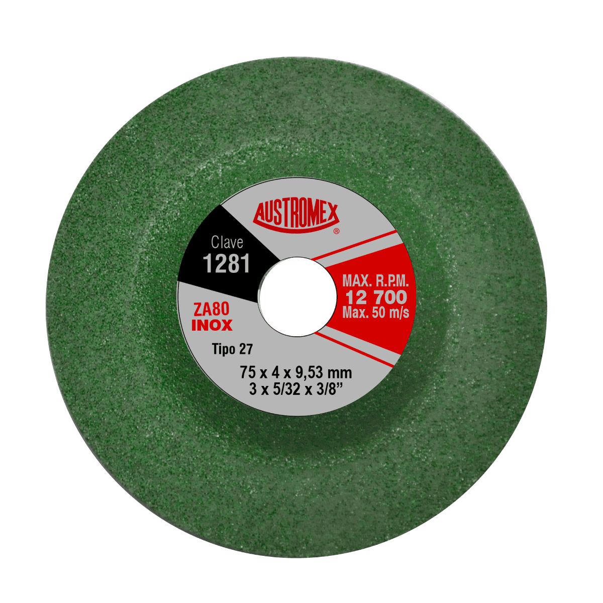 1281 27 ZA80 INOX 3 x 5/32 x 3/8 AUSTROMEX Mini disco tipo 27 de 75 mm – Grano 80 para acabado fino. Micro Esmeriladora