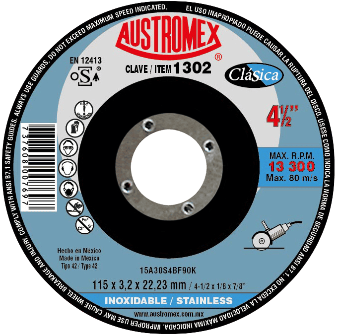 1302 42 15A30S4BF90K 4-1/2 x 1/8 x 7/8 AUSTROMEX Disco con centro deprimido para corte de acero inoxidable Esmeriladora Angular