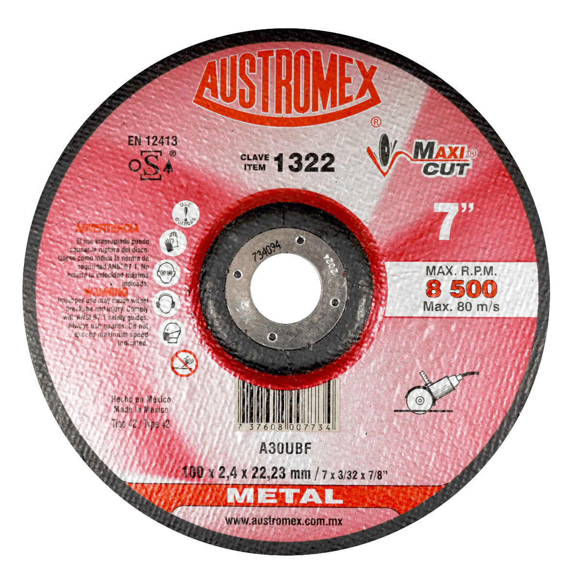 1322 42 A30UBF 7 x 3/32 x 7/8 AUSTROMEX Disco con centro deprimido para corte de metal Esmeriladora Angular