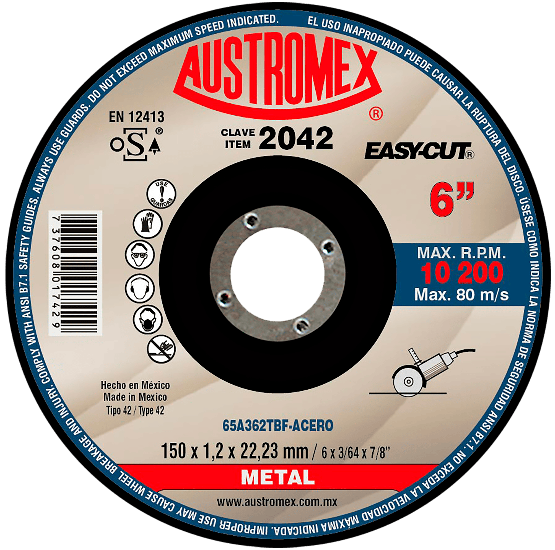 2042 42 65A362TBF-ACERO 6 x 0.045 x 7/8 AUSTROMEX Disco con centro deprimido para corte de metal Esmeriladora Angular