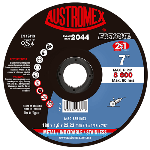 2044 41 A46Q-BFB INOX 7X1/16X7/8 Disco de corte 2 en 1 para acero al carb贸n y acero inoxidable de 180 x 1.6 x 22.23, EASY CUT Esmeriladora Angular