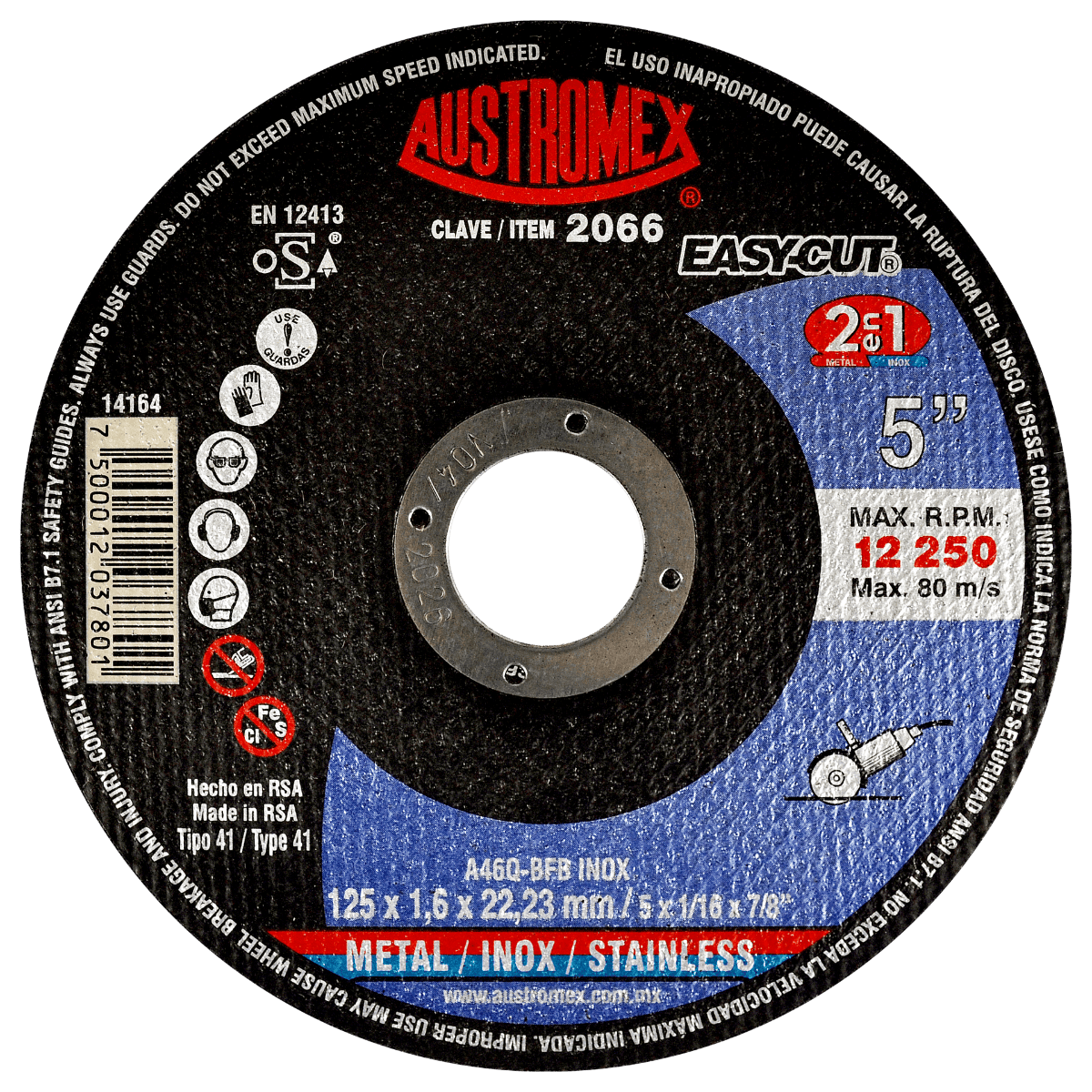 2066 41 A46Q-BFB INOX 5 x 1/16 x 7/8 AUSTROMEX Disco para corte preciso de metal e inoxidable de 125 x 1.6 x 22.23 mm Esmeriladora Angular