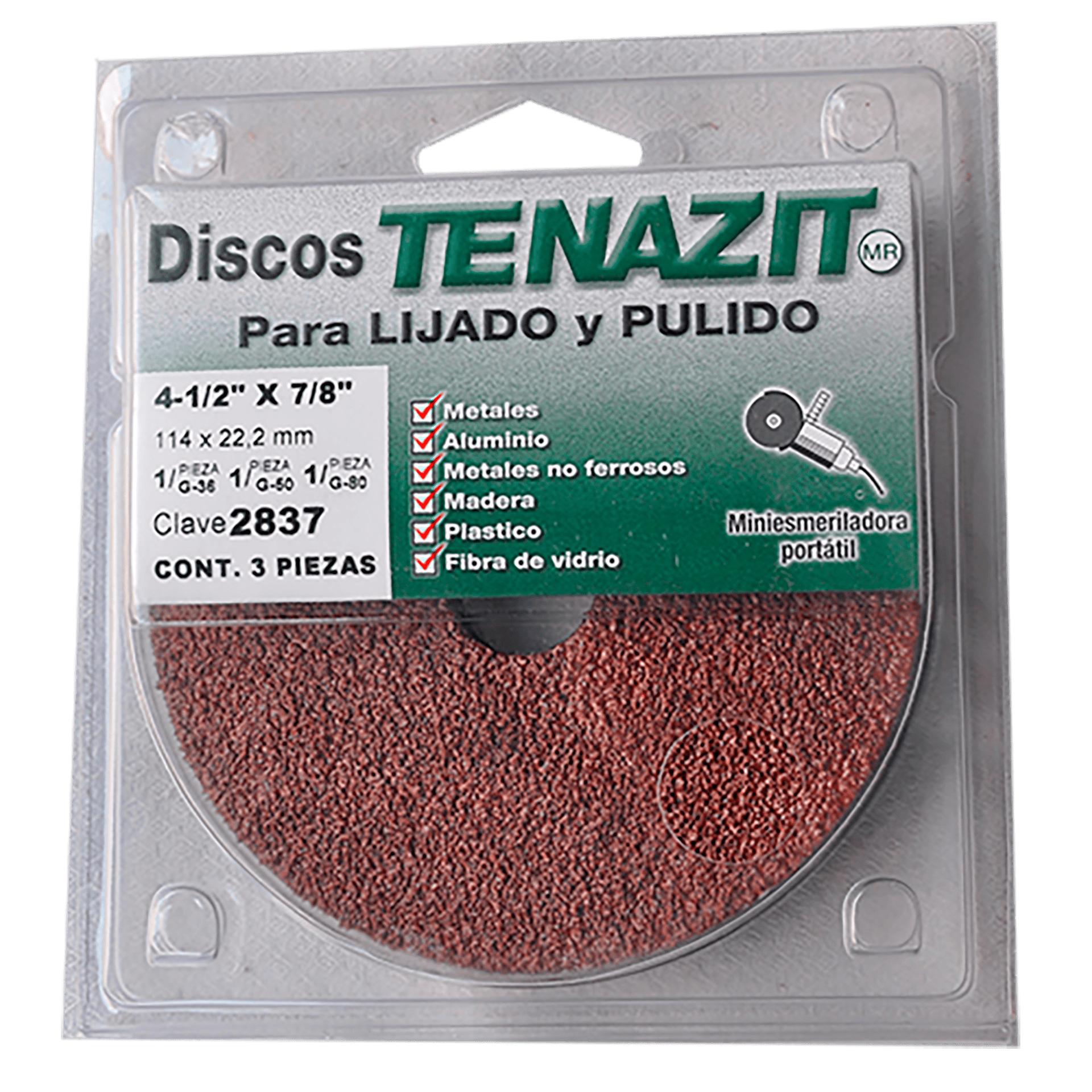 2837 PAQ 3 DL AAA-36-50-80 4-1/2 x 7/8 TENAZIT Paquete de fibrodiscos de Óxido de aluminio granos 36/50/80 Esmeriladora Angular