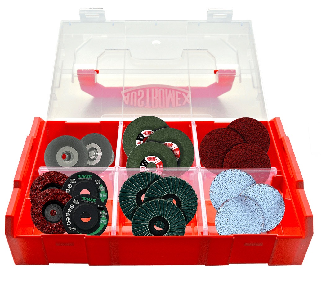 2942 CAJA JUEGO MICROESMERILADORA 10 x 6 x 2 AUSTROMEX Juego para usar con la micro esmeriladora claves 2542 / 2543 de 260 x 155 x 55 mm con 28 piezas. Micro Esmeriladora