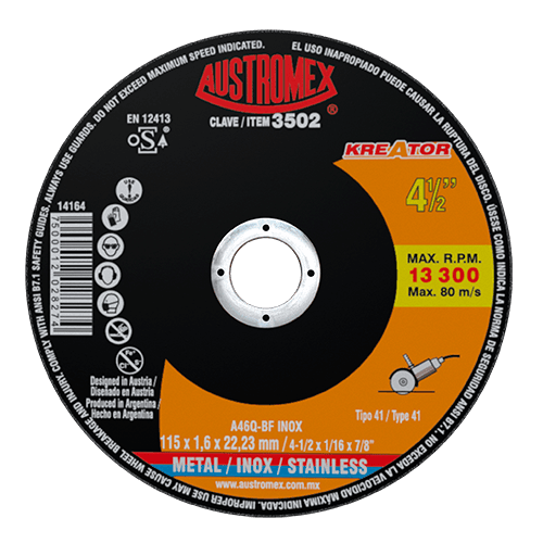 3502 41 A46Q-BF INOX 4-1/2X1/16X7/8 AUSTROMEX Disco de corte 2 en 1 para acero al carb贸n y acero inoxidable de 115 x 1.6 x 22.23, KREATOR Esmeriladora Angular