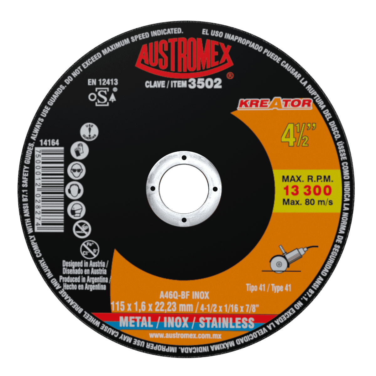 3502 41 A46Q-BF INOX 4-1/2 x 1/16 x 7/8 AUSTROMEX Disco de corte 2 en 1 para acero al carbón y acero inoxidable de 115 x 1.6 x 22.23, KREATOR Esmeriladora Angular