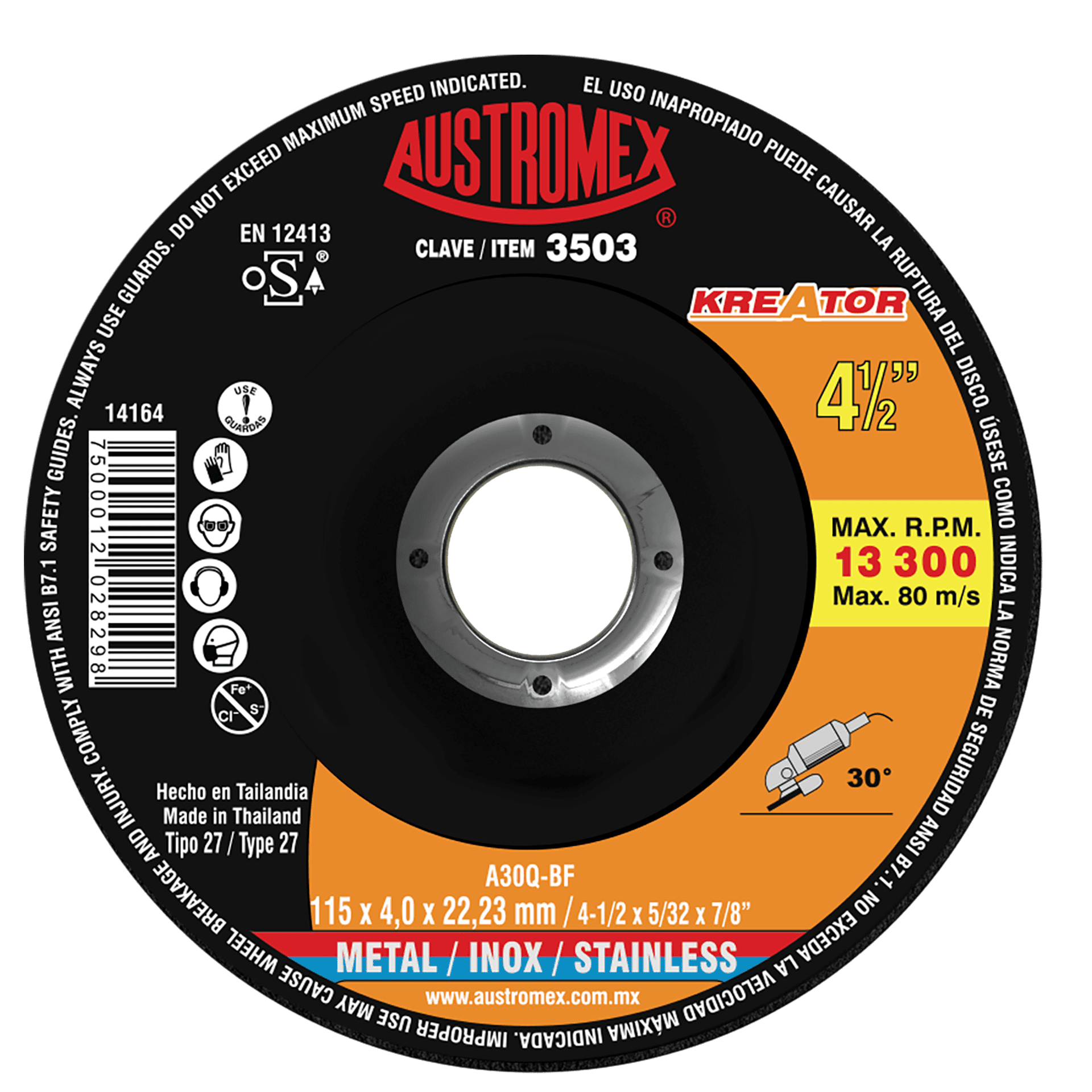 3503 27 A30Q-BF INOX 4-1/2 x 5/32 x 7/8 AUSTROMEX Disco para desbaste y corte, 2 en 1 para acero al carbón y acero inoxidable de 115 x 4.0 x 22.23,KREATOR Esmeriladora Angular