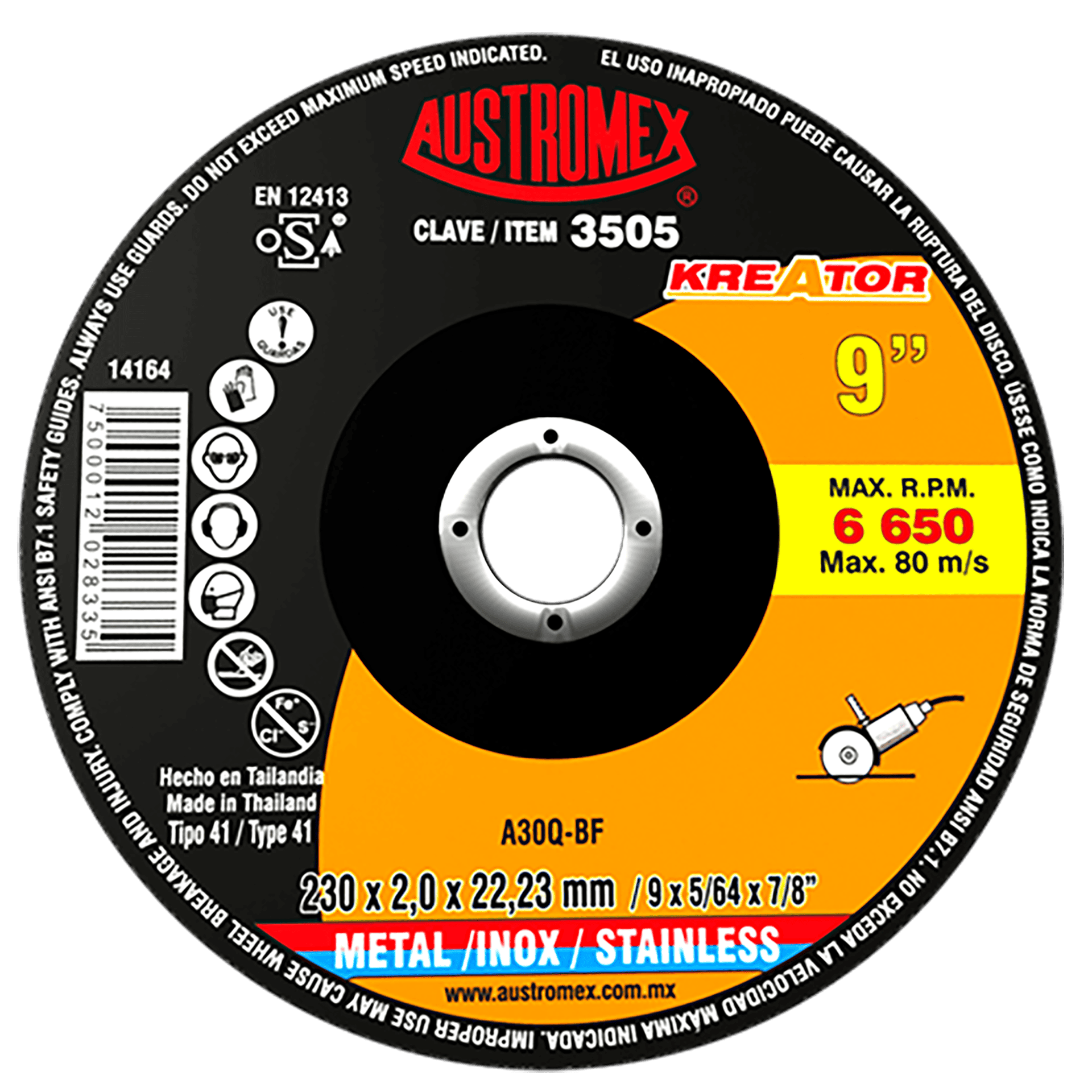 3505 41 A30Q-BF INOX 9 x 5/64 x 7/8 AUSTROMEX Disco de corte 2 en 1 para acero al carbón y acero inoxidable de 230 x 2.0 x 22.23, KREATOR Esmeriladora Angular