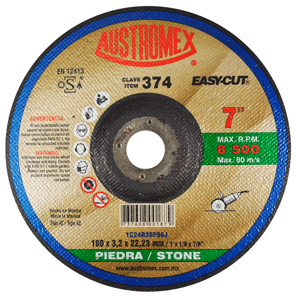 374 42 1C24R3BF96J 7 x 1/8 x 7/8 AUSTROMEX Disco con centro deprimido para corte de piedra Esmeriladora Angular
