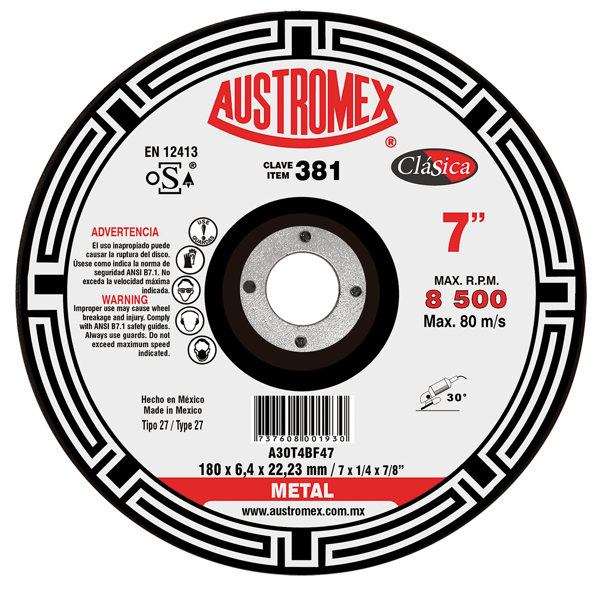 381 27 A30T4BF47 7 x 1/4 x 7/8 AUSTROMEX Disco con centro deprimido para desbaste de metal Esmeriladora Angular