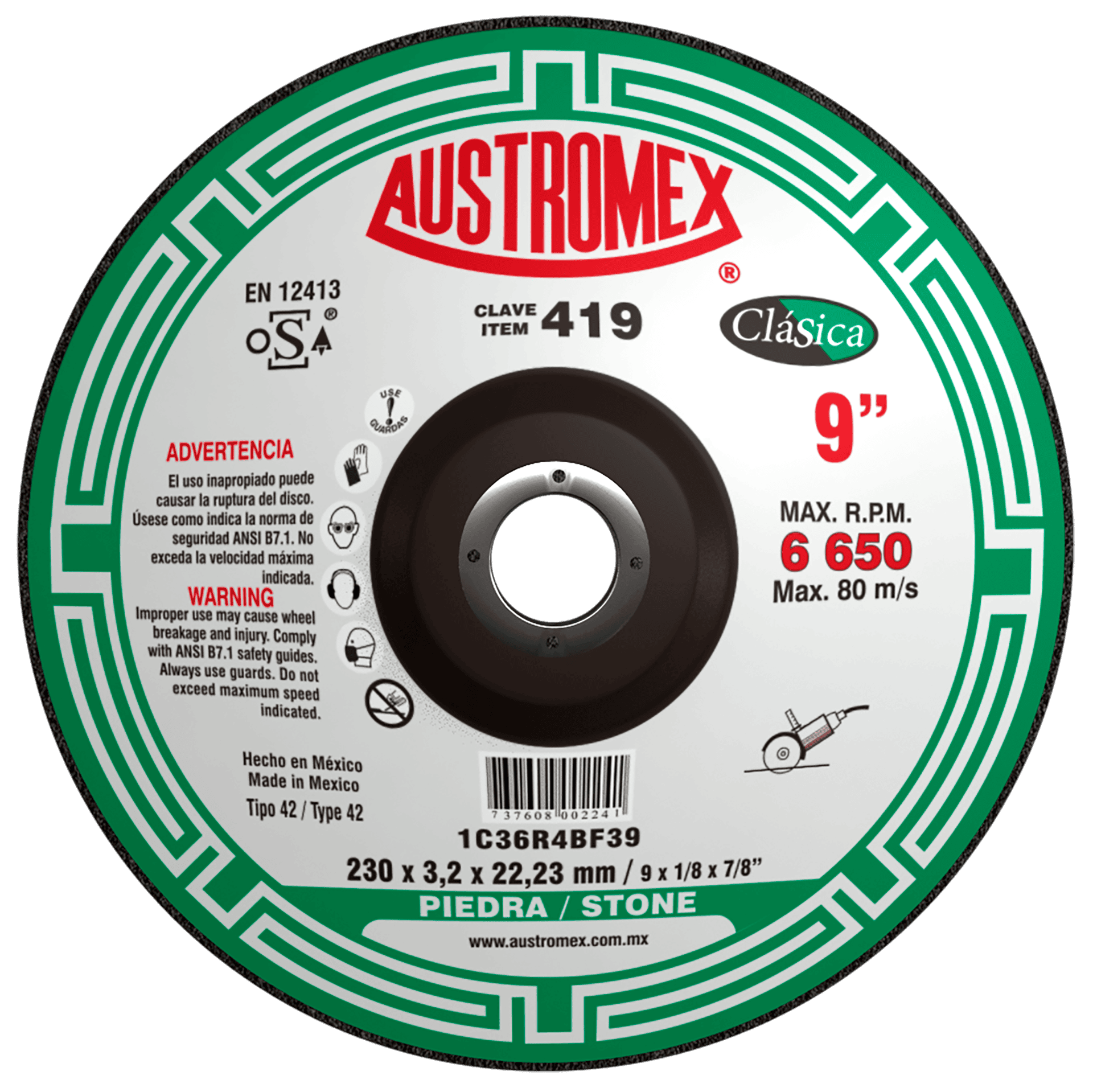 419 42 1C36R4BF39 9 x 1/8 x 7/8 AUSTROMEX Disco con centro deprimido para corte de piedra Esmeriladora Angular