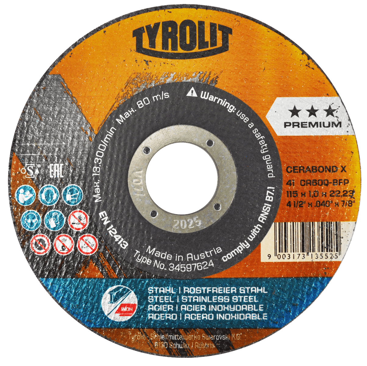 4250 41 CA60Q-BFK A 4-1/2 x 0.04 x 7/8 TYROLIT Disco de corte Tyrolit Cerabond superdelgado de 115 x 1.0 mm, 2 en 1 Esmeriladora Angular