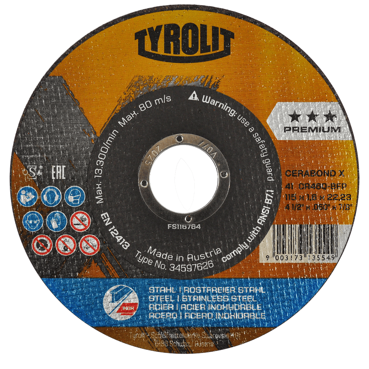 4257 4 1/2 x 1/16 x 7/8 Disco de corte Tyrolit Cerabond X de 115 x 1.6 x 22.23 mm, 2 en 1.