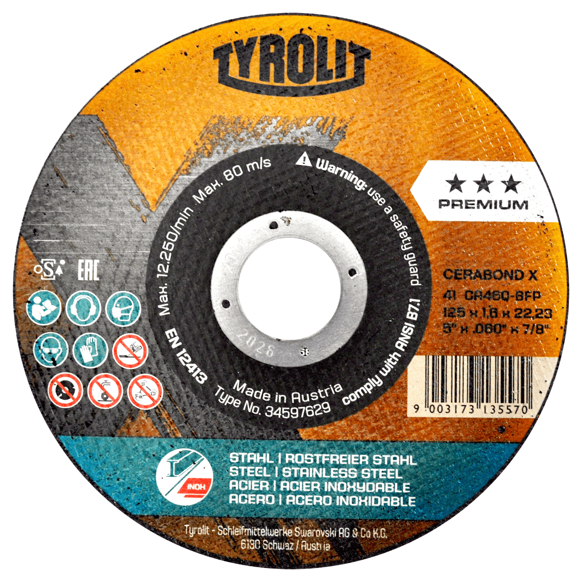 4259 41 CA46Q-BFP 5 x 1/16 x 7/8 TYROLIT Disco de corte Tyrolit Cerabond X de 125 x 1.6 x 22.23 m, 2 en 1. Esmeriladora Angular