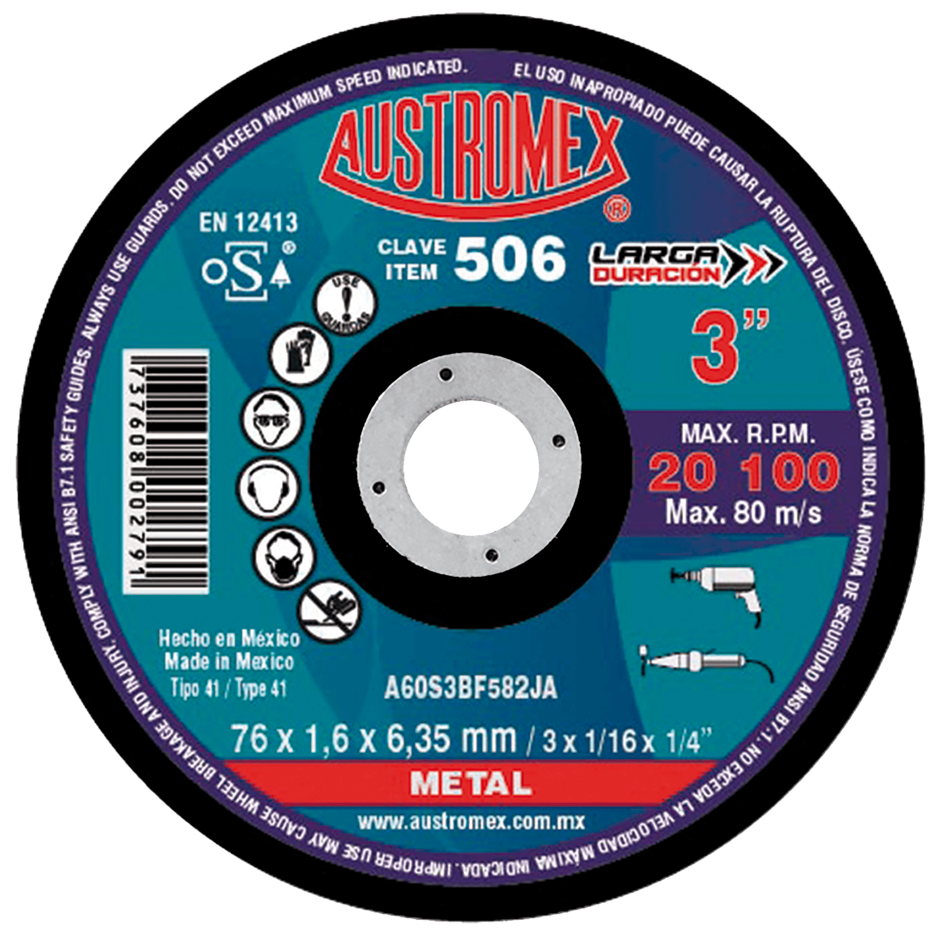 506 41 A60S3BF582JA 3 x 1/16 x 1/4 AUSTROMEX Disco para corte de metal Mototool, Taladro