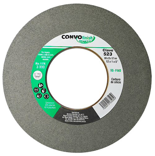 523 12X1X5 Rueda convo de carburo de silicio, densidad 9, grano fino, para rebabeo de metal y pre pulido.