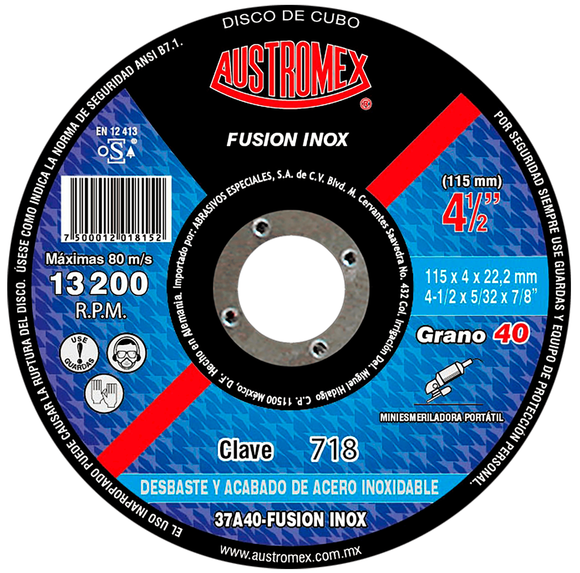 718 27 37A40P-BF FUSION INOX 4-1/2 x 5/32 x 7/8 AUSTROMEX Disco con centro deprimido para desbaste de acero inoxidable grano 40 Esmeriladora Angular