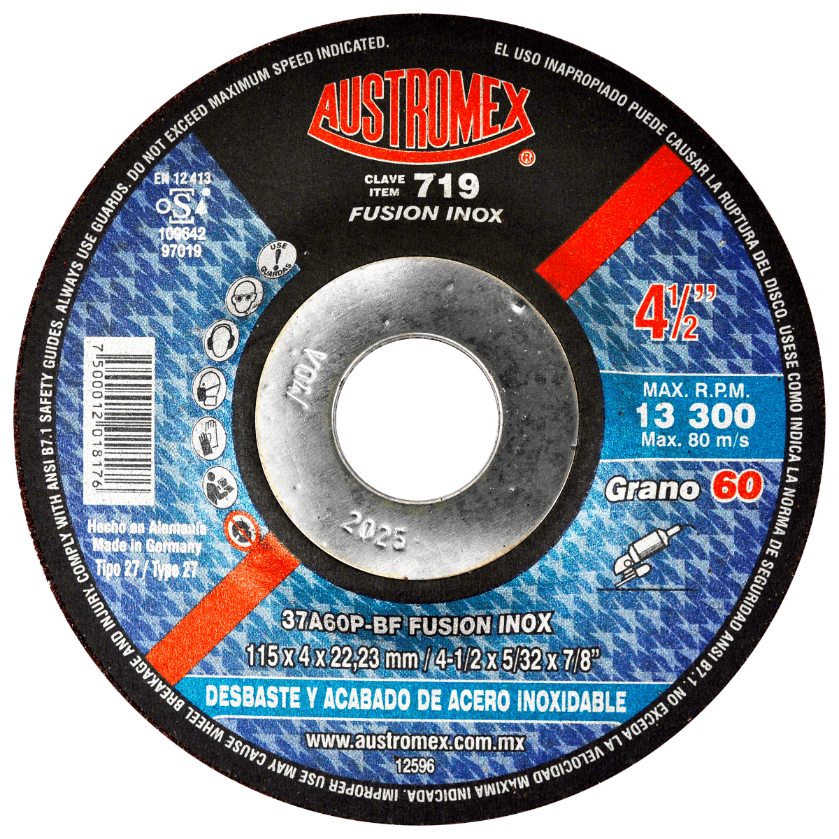 719 27 37A60P-BF FUSION INOX 4-1/2 x 5/32 x 7/8 AUSTROMEX Disco con centro deprimido para desbaste de acero inoxidable grano 60 Esmeriladora Angular