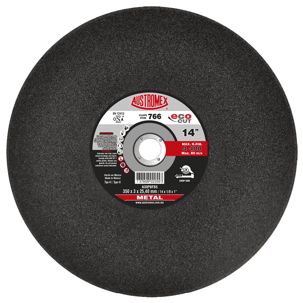 766 41 A30PBFB5 14 x 1/8 x 1 AUSTROMEX Disco de 350 x 3 x 25.4 mm para corte de metal. Chop Saw